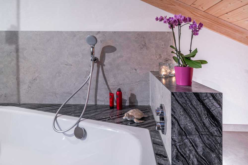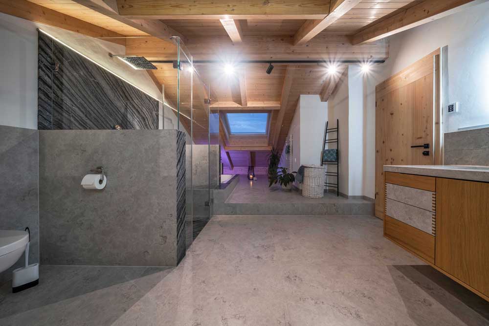 Die Gestaltung lebt vom spannenden Kontrast: lebendige Natursteinmuster treffen auf ruhige, großformatige Platten in Grau – ein Wechselspiel, das dem Bad Tiefe, Charakter und eine außergewöhnliche Atmosphäre verleiht.