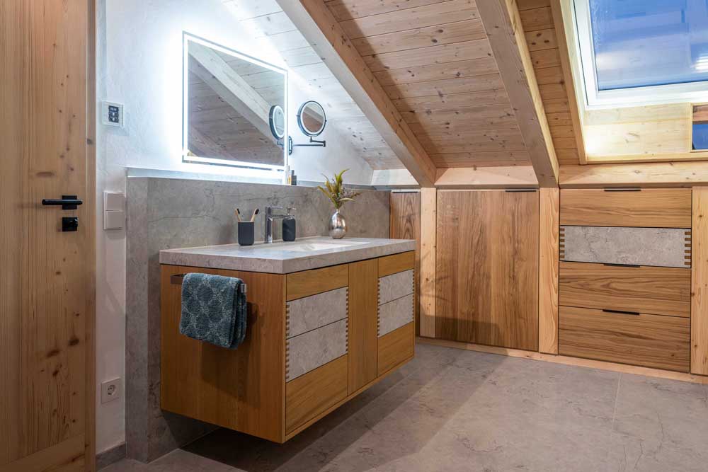 Dieses großzügige 20 m² große Masterbad im Dachgeschoss beeindruckt durch das perfekte Zusammenspiel von warmem Holz und edlem Naturstein. Unter der Dachschräge wurden maßgefertigte Waschtisch- und Stauraumlösungen integriert, die Funktionalität mit exklusivem Design verbinden.